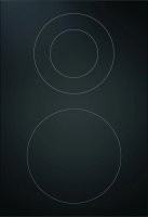 Передняя конфорка диаметром 235 мм имеет мощность 2100 Вт с возможностью повышения до 3200 Вт. Задняя конфорка включает два контура (Ø120/200 мм) мощностью 800/1900 Вт. Длина кабеля питания 1.5 м, защита предохранителями 2×16 A.