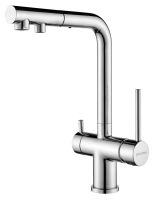Смеситель оснащен гибким выдвижным изливом из нейлоновой оплетки, которая обладает отличной устойчивостью к истиранию и разрушению. Данная техническая особенность расширяет рабочую зону смесителя, позволяя пользоваться им с удобством в больших мойках, мойках с двумя чашами, или наполнять водой ёмкость на столе рядом с мойкой, в том числе питьевой водой.