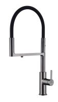 Гибкий силиконовый излив оснащен функцией деликатного душа и магнитным механизмом фиксации в задней части латунного корпуса. Он позволяет ополоснуть посуду или мойку в любой ее части или наполнить емкости даже на столе рядом с мойкой.